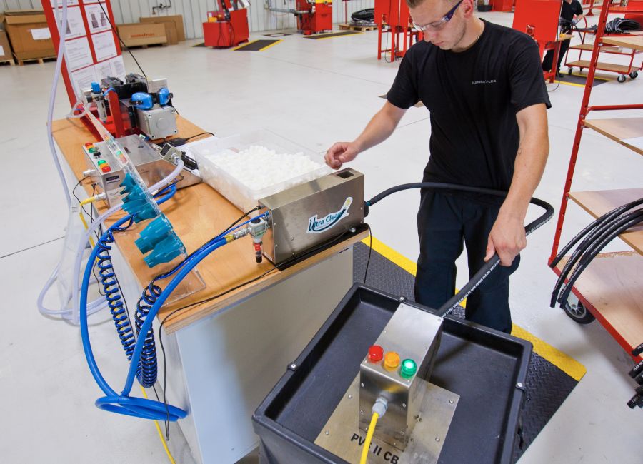 Katru šļūteni tūlīt pēc griešanas mēs sausā veidā attīrām, pirms svešķermeņi paspēj pielipt. Tīrīšanai tiek izmantots projektils, kas ar augstu spiedienu tiek izšauts caur visu šļūtenes garumu no abām pusēm, pilnībā izvadot smalkās un brīvās netīrumu daļiņas.